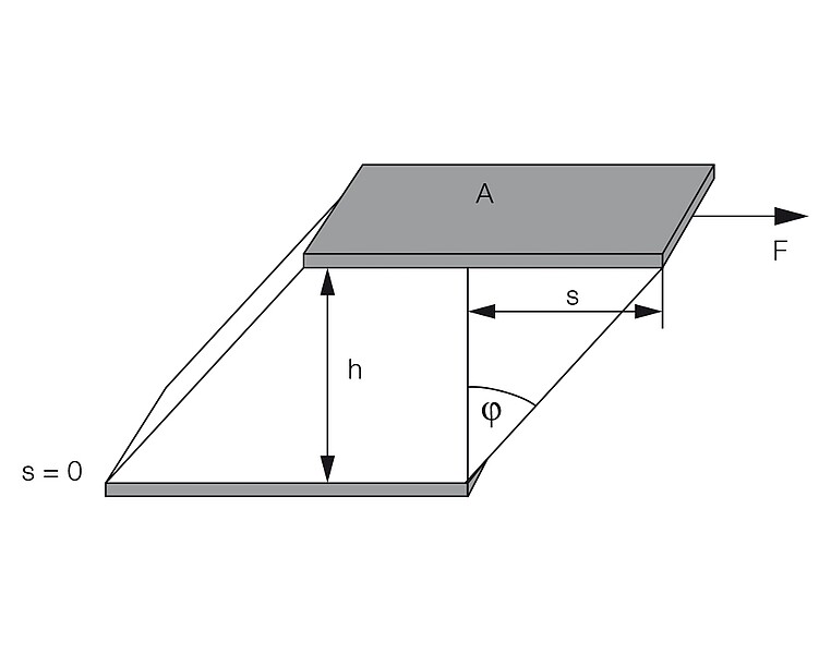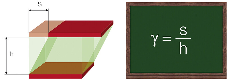 Definition: γ = s / h with shear strain γ (pronounced: gamma), deflection path s (in m), and shear gap h (in m), see Figure 8.4. The unit for shear deformation is (m/m) = 1, which means that deformation is dimensionless. Usually, the value is stated as a percentage.