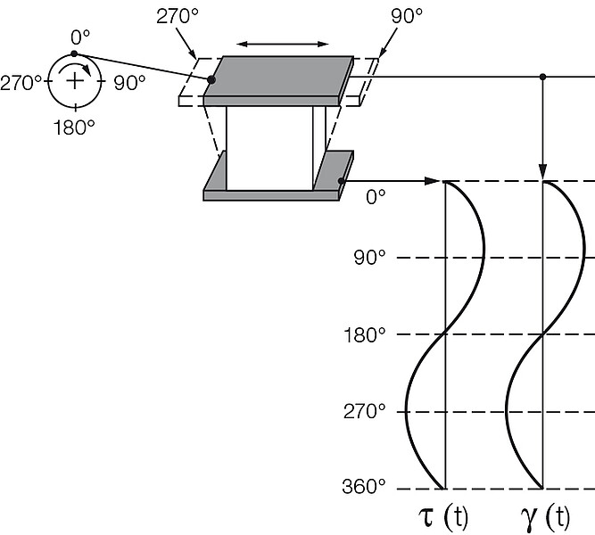 The two-plates model can also be used for explaining oscillatory tests (Figure 9.1). A sample is sheared while sandwiched between two plates, with the upper plate moving and the lower plate remaining stationary. A push rod mounted to a driving wheel moves the upper plate back and forth parallel to the lower plate, as long as the wheel is turning. At constant rotational speed, the model operates at a correspondingly constant oscillating frequency.
