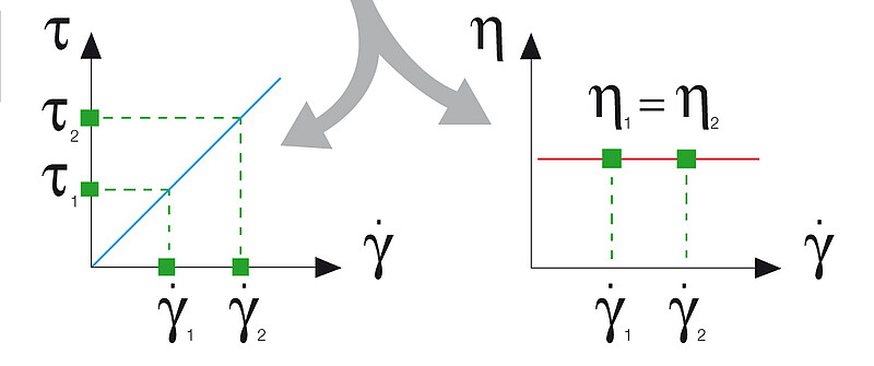 Figure 4.5: The law of viscosity: Viscosity $\eta$ is defined as shear stress $\tau$ divided by shear rate $\dot{\gamma}$ (left). The law of viscosity, here depicted as follows: shear stress $\tau$ is shear rate $\dot{\gamma}$ times viscosity $\eta$ (right).