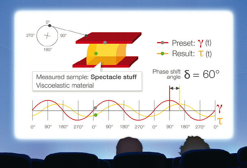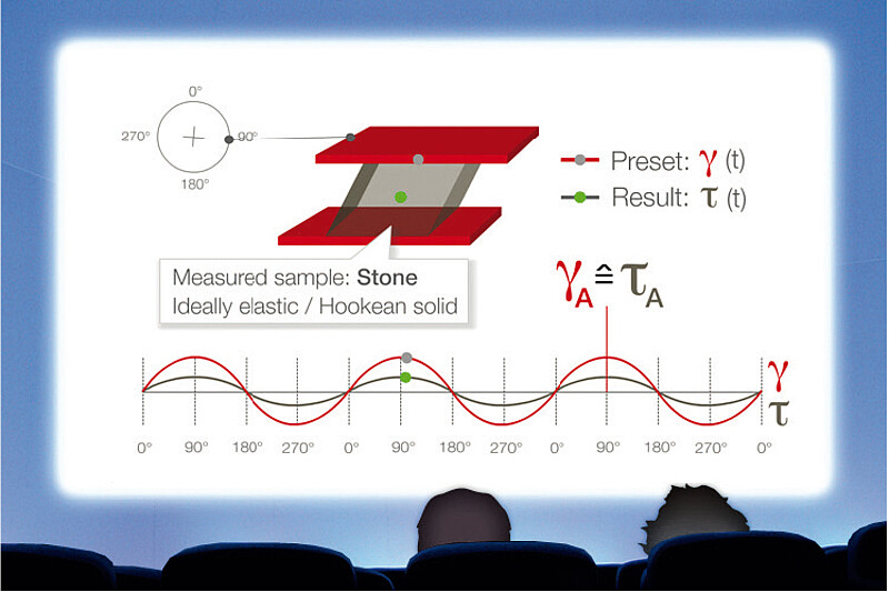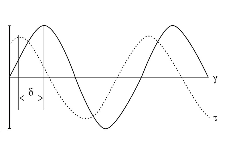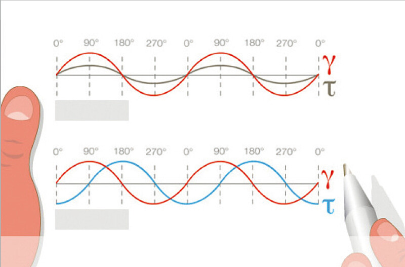 In addition the force that acts upon the lower, stationary plate is measured. This force is required as a counter force to keep the lower plate in position. The signal is rheologically evaluated as shear stress $\tau$. If the sample is not strained by too large a deformation, the resulting diagram over time is a sinusoidal curve of the shear stress with the amplitude $\tau_A$. The two sine curves, i.e. the preset as well as the response curve, oscillate with the same frequency. However, if too large a strain were to be preset, the inner structure of the sample would be destroyed, and the resulting curve would no longer be sinusoidal.