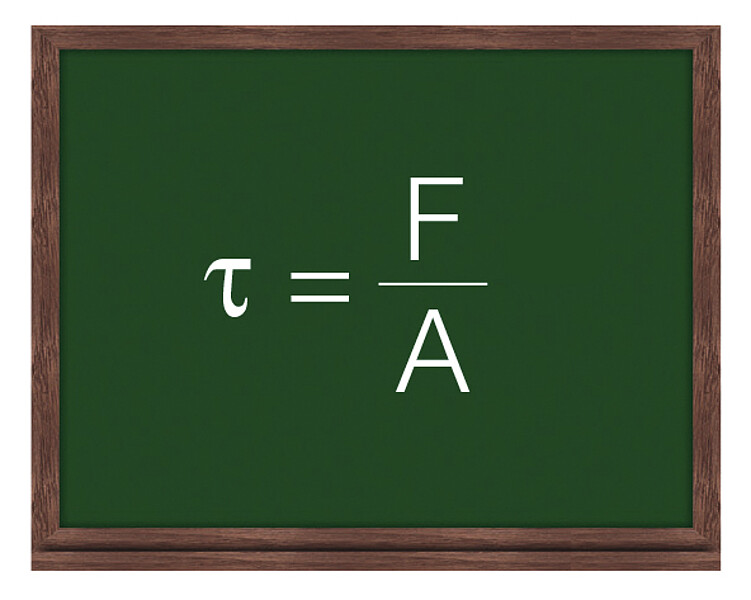 Definition: $\tau$ = F / A with shear stress $\tau$ (pronounced: tau), shear force F (in N) and shear area A (in m2), see Figures 8.2 and 8.3. The unit for shear stress is N/m2 = Pa (pascal).