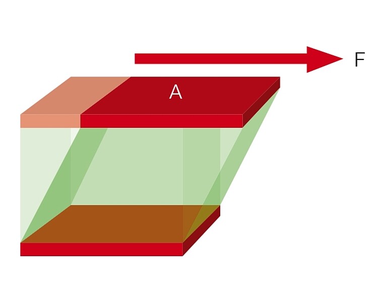 Definition: $\tau$ = F / A with shear stress $\tau$ (pronounced: tau), shear force F (in N, newton) and shear area A (in m2), see Figure 4.3. The unit for shear stress is 1 N/m2 = 1 Pa (pascal). A rheometer records the shear force via the torque at each measuring point.