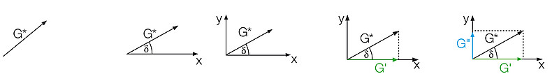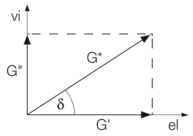 The phase shift δ, which is the time lag between the preset and the resulting sinusoidal oscillation is determined for each measuring point. This angle, always between 0° and 90°, is now placed below the G* vector (Figure 9.9).