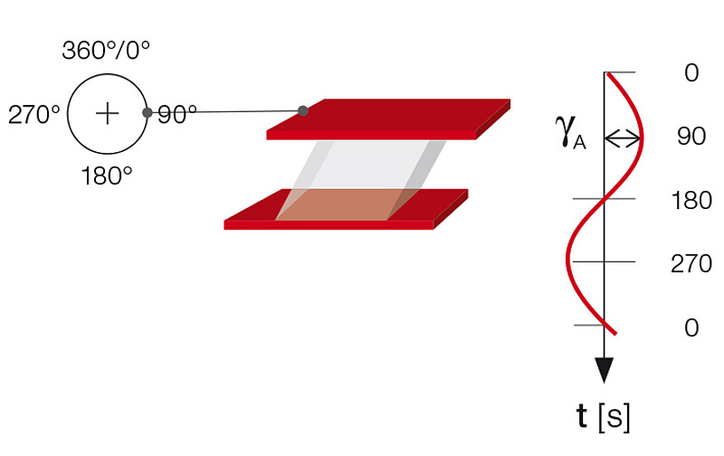 The deflection path of the upper, movable plate is measured and rheologically evaluated as strain or deformation $\gamma$. When the driving wheel moves, the strain plotted versus time results in a sine curve with the strain amplitude $\gamma_A$ (Figure 9.2).