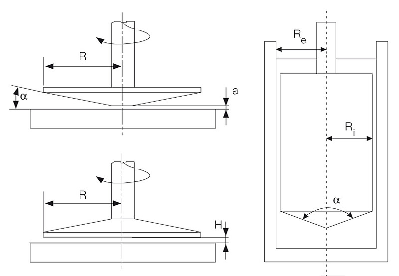Absolute values, for example viscosity, can only be determined with absolute measuring systems. In contrast to relative values, absolute values do not correlate with the size of the measuring system. They have a relatively narrow shear gap as defined by specific standards for measuring systems such as ISO 3219[f] and DIN 53019[g]. These standards describe the following measuring geometries (Figure 2.2 and 2.3): cone-plate, concentric cylinders and plate-plate.