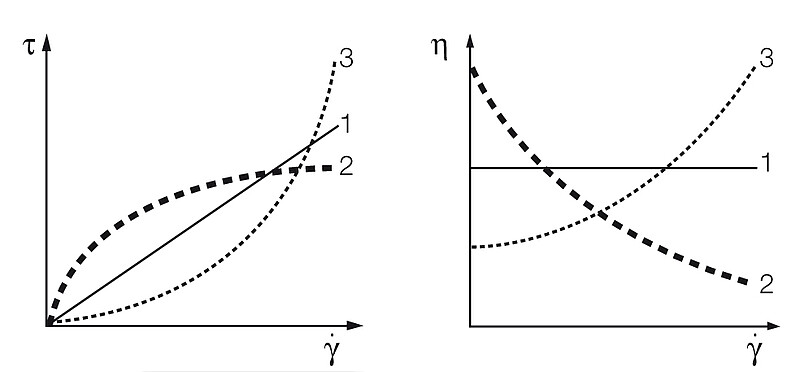 Ideally viscous flow behavior (or: Newtonian flow behavior) means that the measured viscosity is independent of the shear rate (Figure 5.2, line 1). Typical materials from this group include water, mineral oil, silicone oil, salad oil, solvents such as acetone, as well as viscosity standards (e.g. calibration oils).