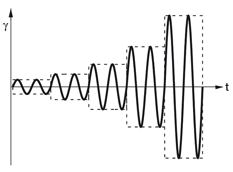 Parameters for oscillatory tests are usually preset in the form of a sine curve. For the two-plates model, as described above, the test is a controlled sinusoidal strain test. A sine curve is determined by its amplitude (maximum deflection) and its oscillation period. The oscillation frequency is the reciprocal of the oscillation period (Figure 9.3).