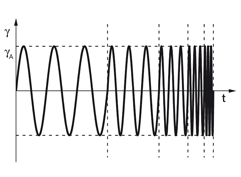 Frequency sweeps generally serve the purpose of describing the time-dependent behavior of a sample in the non-destructive deformation range. High frequencies are used to simulate fast motion on short timescales, whereas low frequencies simulate slow motion on long timescales or at rest. In frequency sweeps (Figure 9.15), the oscillation frequency is increased or decreased step-wise from one measuring point to the next while keeping the amplitude constant.