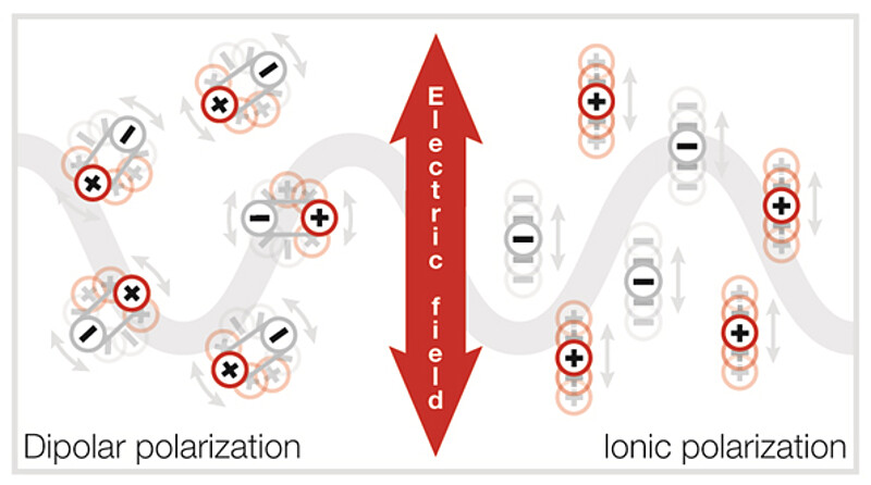 • Pour qu'une substance puisse générer de la chaleur lorsqu'elle est irradiée par des micro-ondes, elle doit être un dipôle, ce qui signifie que sa structure moléculaire doit être partiellement chargée négativement et partiellement chargée positivement. Puisque le champ micro-ondes est oscillant, les dipôles dans le champ s'alignent sur le champ oscillant. Cet alignement provoque une rotation, ce qui entraîne des frottements et finalement de l'énergie thermique.