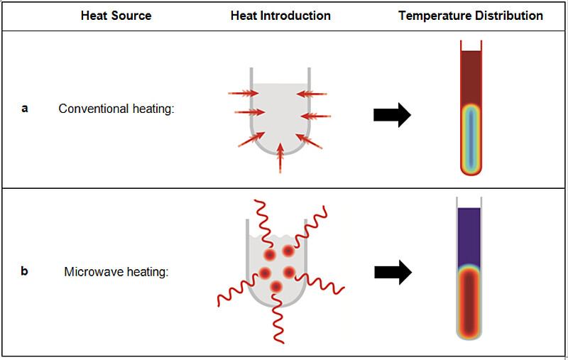 Les récipients de réaction sont fermés et scellés, puis chauffés à des températures dépassant le point d'ébullition du mélange réactionnel. En revanche, l'irradiation par micro-ondes entraîne un chauffage interne économe en énergie par couplage direct de l'énergie micro-ondes avec des dipôles et/ou des ions présents dans le mélange réactionnel. Les micro-ondes traversent le mur du récipient (presque) transparent aux micro-ondes et chauffent le mélange réactionnel sur une base moléculaire – par interaction directe avec les molécules (solvants, réactifs, catalyseurs, etc). En raison de ce chauffage direct « dans le noyau » (pas de chauffage initial de la surface du récipient), l'irradiation micro-ondes entraîne des gradients de température inversés par rapport à un système chauffé de manière conventionnelle (Figure 2, entrée b).
