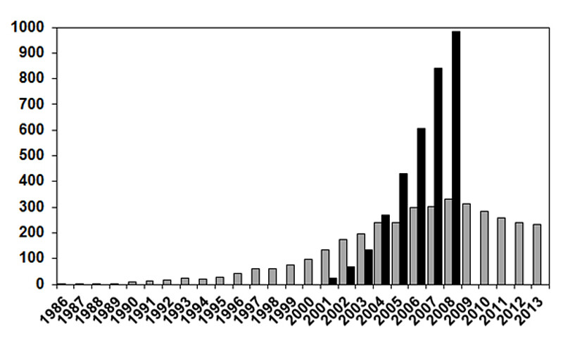 Figure 1 : Nombre de publications sur la synthèse organique assistée par micro-ondes (1986-2013).<a href="t3://page?uid=926#16985">[7]</a> Barres grises : Nombre d'articles impliquant la synthèse organique assistée par micro-ondes (recherche par mots-clés).[8] Les barres noires représentent le nombre de publications (2001-2008) rapportant des expériences de synthèse par micro-ondes réalisées dans des réacteurs scientifiques avec un contrôle de processus adéquat (recherche dans le texte complet).<a href="t3://page?uid=926#16985">[9]</a> Courtoisie de C. O. Kappe, Université de Graz.