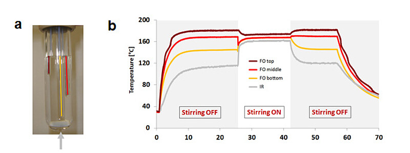 Contrairement aux fours domestiques, les réacteurs à micro-ondes dédiés disposent d'un agitateur magnétique intégré, ce qui est important car sans agitation appropriée, la distribution de la température dans le mélange de réaction ne sera pas uniforme, et la température mesurée dépendra de la position du capteur de température (comme indiqué dans la Figure 8).