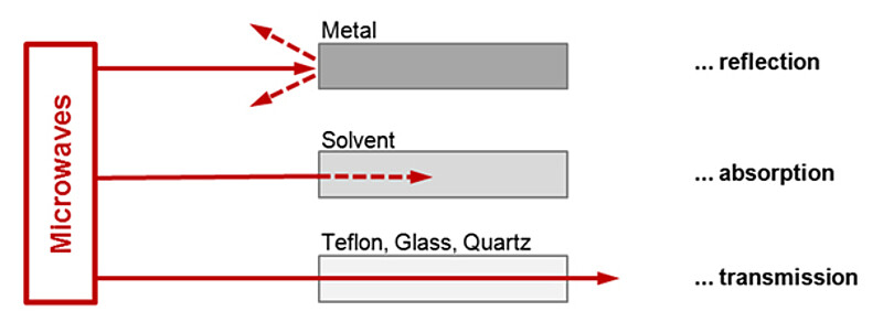En général, trois processus différents caractérisent l'interaction de l'irradiation micro-ondes avec la matière : absorption, transmission et réflexion (Figure 6). Alors que les matériaux hautement diélectriques, comme les solvants organiques polaires, entraînent une forte absorption des micro-ondes et, par conséquent, un chauffage rapide du milieu, les matériaux non polaires (transparents aux micro-ondes) ne montrent que de faibles interactions avec les micro-ondes (transmission). Les micro-ondes traversent de tels matériaux. Cela les rend adaptés en tant que matériaux de construction pour des récipients de réaction. Si les radiations micro-ondes sont réfléchies par la surface du matériau, il n'y a presque aucune introduction d'énergie dans le système.
