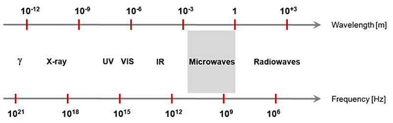 L'irradiation micro-ondes est une irradiation électromagnétique dans la plage de fréquence de 0,3 GHz à 300 GHz, ce qui correspond à des longueurs d'onde entre 1 mm et 1 m (voir Figure 3). Tous les fours à micro-ondes de « cuisine » et les réacteurs à micro-ondes dédiés disponibles dans le commerce pour la synthèse chimique fonctionnent à une fréquence de 2,45 GHz (ce qui correspond à une longueur d'onde de 12,25 cm).