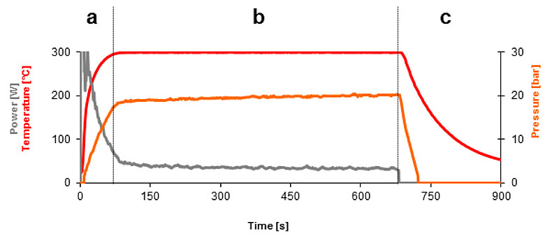 Profil de chauffage d'un mélange réactionnel chauffé à 300 °C durant 10 minutes. Durant l'expérience complète, l'instrument enregistre la température, la pression et la puissance. Un processus d'expérience typique se compose de trois étapes : (a) chauffer à une certaine température, (b) maintenir la température pendant un certain temps et (c) refroidir.