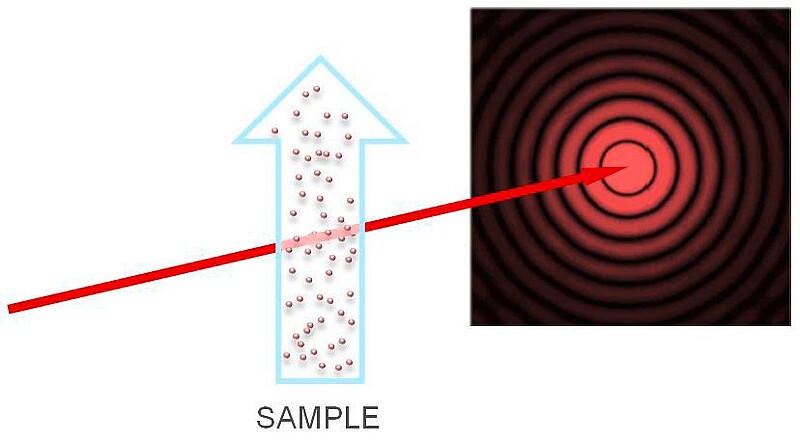 Figure 1: Illustration of laser diffraction in a particle size analyzer. The red arrow represents the laser beam, which shines through the sample (blue arrow). The concentric circles represent a simplified diffraction pattern.