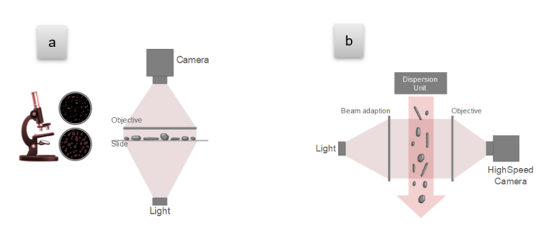 Figure 2: Basic principle of static image analysis (a) and dynamic image analysis (b)
